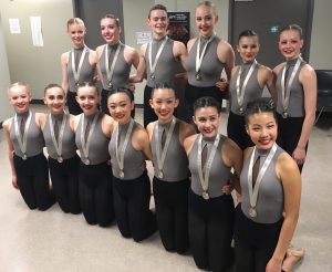 In the Intermediate age level Ballet/Modern/Contemporary “No Borders” competition, “Pair Bonds” choreographed by Cori Caulfield, and classical piece “Ballet Baroque” choreographed by Jocelyn Wozencroft, both danced by the Professional Training Division Half Day Program, and “Hunger of the Pine” choreographed by Hailley Caulfield Postle, danced by the Professional Training Division contemporary group, all peformed beautifully, and all with last minute cast changes – “Hunger of the Pine” missing three! “Pair Bonds” with no rehearsal to adjust to Abriel being unable to dance due to wry neck, were nevertheless selected as the representative number from this category to advance to the Grand Championships.