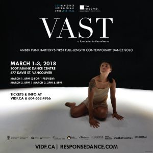 Vast is running March 1 – 3 with the Vancouver International Dance Festival at the Scotia Bank Dance Centre 677 Davie Street, Vancouver.